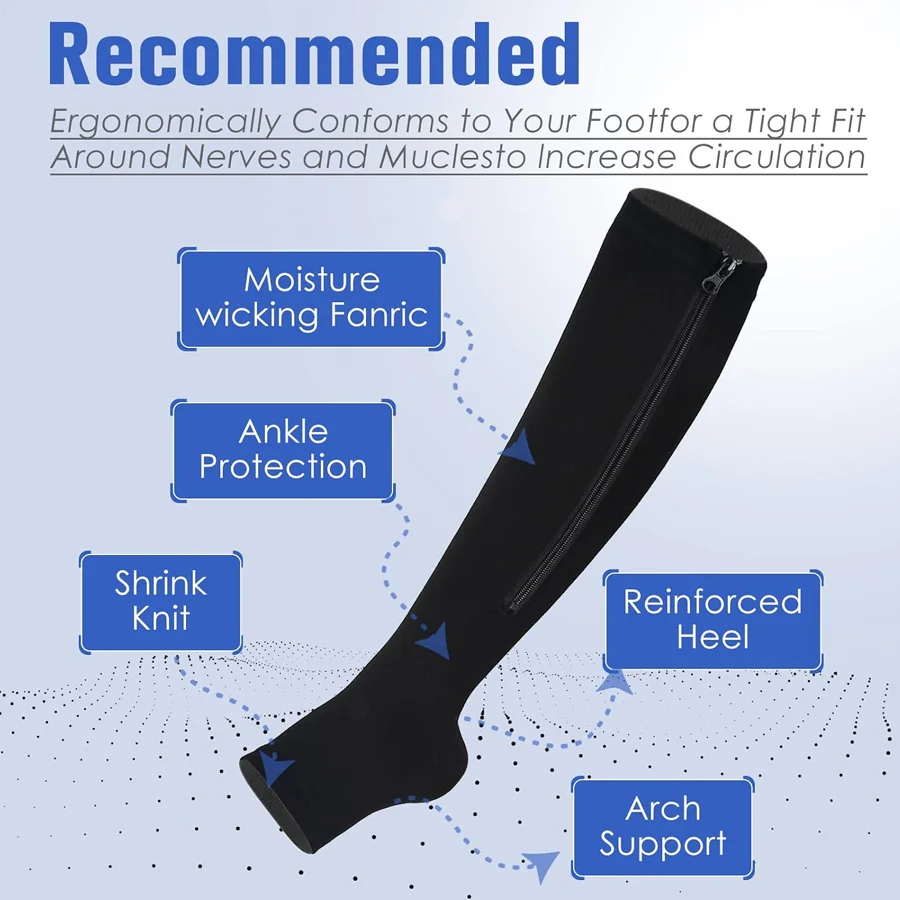 So, I'm new to the world of compression socks, so I wouldn't know much about it. Surely those who have been wearing them for longer will be better at it than me. The socks are comfortable, warm, and snug. I took size L and they tighten just enough. Not too loose, not too tight to die. They are comfortable with the zipper; at first, it pinches a bit but then you get used to it. I have the pots and feel benefits.